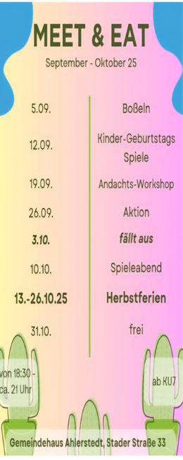 Seit einiger Zeit gibt es die neue Jugendgruppe „Meet and eat“. Jeden Freitag treffen wir uns um 18:30 Uhr im Jugendraum und spielen Spiele, singen, quatschen, hören eine kleine Andacht, essen mega leckeres Essen (z.Bsp. Sandwiches, Waffeln, Brezeln, Pizza…) und haben einfach jede Menge Spaß. 😊 Manchmal haben wir auch besondere Aktionen geplant, z.Bsp. hatten wir schon einen Kinoabend, einen Plätzchen-back-Abend und wir waren zusammen auf dem Weihnachtsmarkt.